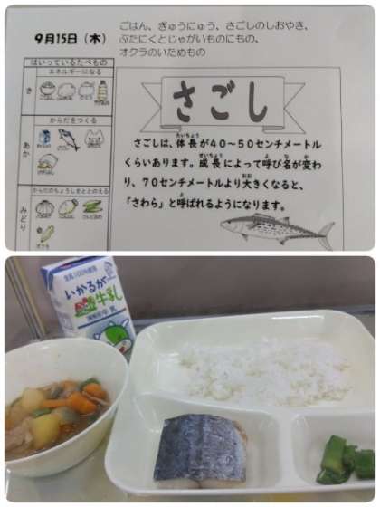 今日の給食は「さごしの塩焼き」「豚肉とじゃがいもの煮物」「オクラのいためもの」「ごはん」「牛乳」です。