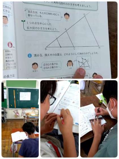 6年生の算数では、コース別に学習を進めています。拡大図、縮小図について学習しています。今日は、拡大図の書き方について、考えました。