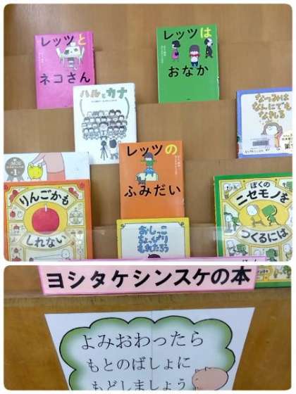 本の紹介コーナーです。学校司書が「ヨシタケシンスケ」の本を集めました。おもしろい内容の本がたくさんあります。一冊、読んでみてはいかがですか。