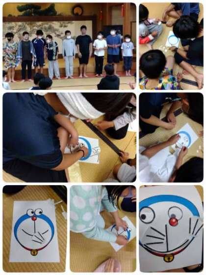 大広間でチームごとにレクレーションをしました。伝言ゲーム、全部しりとり、福わらいと楽しい時間を過ごしました。