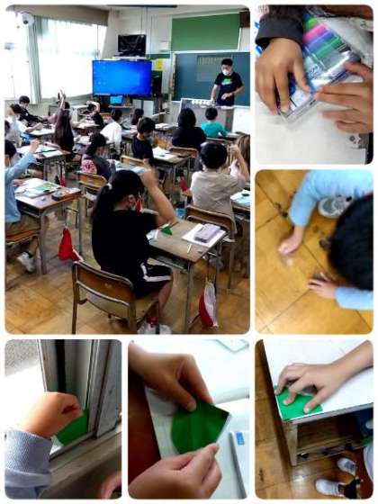 2年生の算数の時間です。単元「三角や四角のかたちをしらべよう」で、折り紙を使い、直角について、学びました。教室の中にある「直角」について、みんなで探しました。