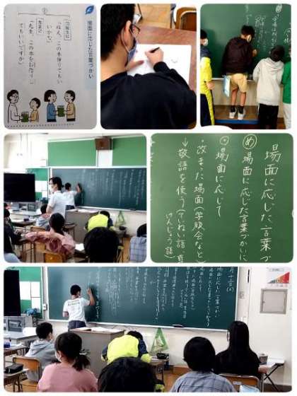 6年生の国語の授業です。「場面に応じた言葉づかい」の学習で、敬語について考えました。社会に出たときにていねいな言葉遣いをすることは、マナーの一部です。しっかり学びましょう。(10月13日 記事)