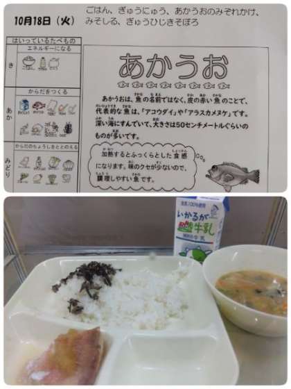 今日の給食は「あかうおのみぞれかけ」「みそしる」「ぎゅうひじきそぼろ」「ごはん」「牛乳」です。