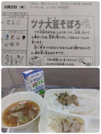 ツナ大豆そぼろは、しょうが、ツナ、大豆、だいこん葉をいため、甘辛く味つけし、ごはんといっしょに食べます。主に体をつくるもとになるたんぱく質やカルシウム、鉄を多く含むおかずです。