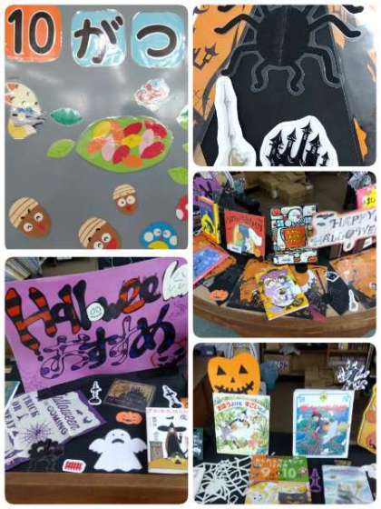 10月の図書室です。「ハローウィンに関する本」を選び、展示しています。「魔女の宅急便」など、映画やアニメになった本もあります。一度、挑戦してみてはいかがですか?
