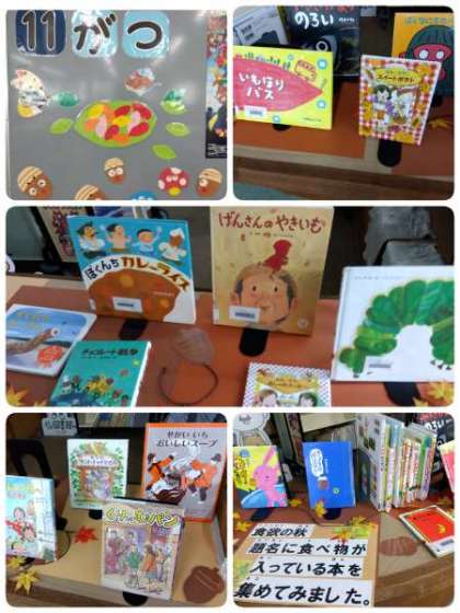 11月の図書室です。「食欲の秋:題名に食べ物が入っている本」を選び、展示しています。「やきいも」「カレーライス」「クリームパン」どれもおいしそうな名前が・・・どんなお話か読んでみてくださいね。
