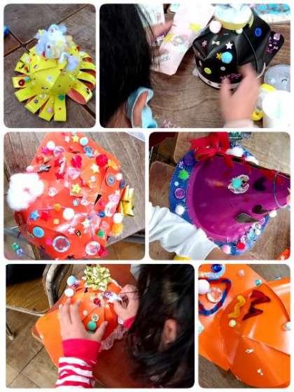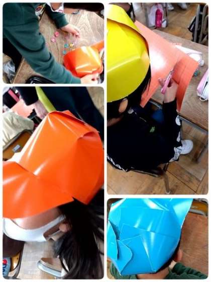 2年生の図工です。自分の好きな模様をぼうしにつけて、自分だけの「おしゃれなぼうし」を作成しました。かっこいいですね。
