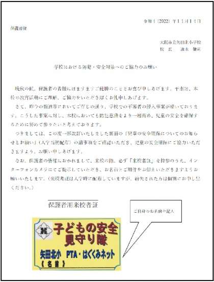 なお、保護者の皆様におかれまして、来校の際、必ず「来校者証」を持参のうえ、インターフォンカメラにてご提示していただき、お名前とご用件をお伝えいただきますようお願いいたします。