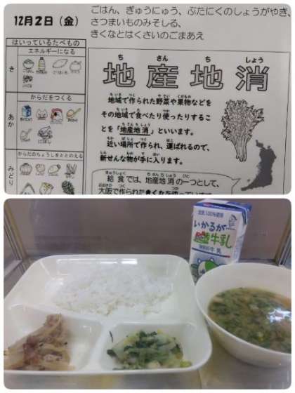地域で作られた野菜や果物などをその地域で食べたり使ったりすることを「地産地消」といいます。近い場所で作られ、運ばれるので、新鮮なものが手に入ります。給食では、地産地消の一つとして、大阪で作られた「きくな」を使っています。