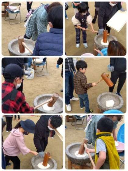地域の方をはじめ、矢田北小学校の子どもたちもたくさん参加していました。あんこや醤油、きなこ等、つきたての「おもち」をおなか一杯食べることができました。途中、子どもたちのもちつき体験もありました。