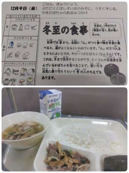 日本では、昔から、名前に「ん」がつく食べ物を冬至に食べると、運がよくなるといわれています。「ん」が2つ入るとさらによいとされ、その一つがかぼちゃ(なんきん)です。これは、冬まで保存することができ、たくさんの栄養素を含んでいるかぼちゃを食べることで、寒い冬を元気に乗り切ろうという昔の人のちえでもあります。
