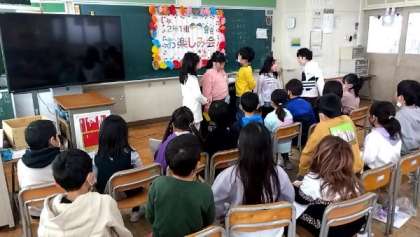2年生がお楽しみ会をしました。班ごとに出し物を決め、チームで発表していました。クイズやお笑い、音当て、ジェスチャーなど、楽しい出し物がいっぱいでした。