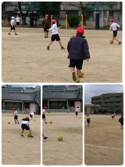 2年生の体育の授業です。「サッカー」の練習をしていました。しっかりとボールを止め、ねらいを定めて「キック!!」寒さの負けず、運動場を元気に走り回っていました。