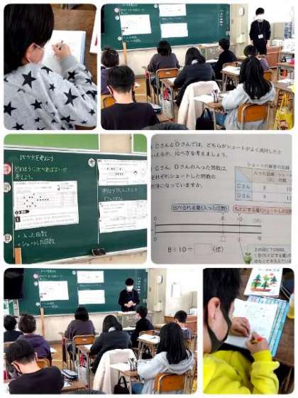 5年生の算数の授業です。「どのように比べればよいかを考えよう」との課題でシュート数の違う場合を比較していました。