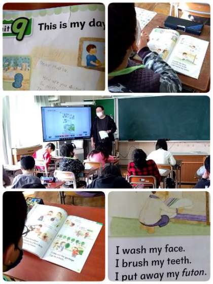 4年生の外国語の学習です。「This is my day」あなたの一日は、どのように過ごしますか。それぞれの一日を英語で振り返りました。