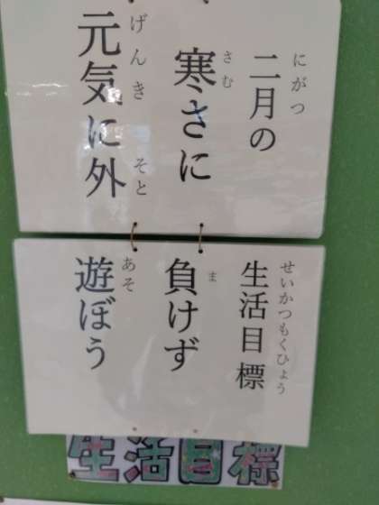 2月の生活目標は「寒さに負けず 元気に外で遊ぼう」です。