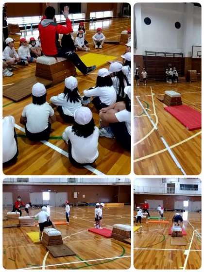 2年生の体育の学習の様子です。体育館で「とびばこ」の学習をしていました。担任の話を真剣に聞く姿が素敵です。コツをつかんだ児童が、