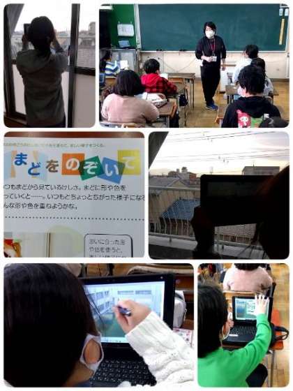 4年生の図工です。「まどをのぞいて」という学習を進めています。普段、窓から見ている景色。その景色に色々とアレンジを加え、作品に仕上げます。どんな作品になるか楽しみですね。
