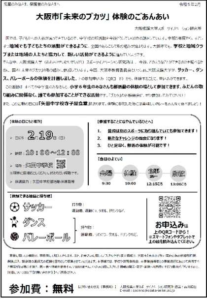 この度、矢田中学校にて、「未来のブカツ」の取り組みが行われます。大阪市教育委員会と大阪成蹊大学が連携し、サッカー、ダンス、バレーボールの体験を6年生対象に企画しました。中学校進学に向け、ご都合がつきましたら、是非ご参加ください。