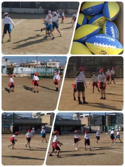 4年生の体育の時間です。運動場でタグラグビーをしていました。大きな声をかけあいながら、パス回しをしていました。
