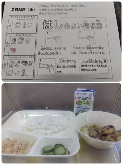 今日の給食は「すき焼き煮」「もやしとささみの炒め物」「きゅうりのゆず風味」「ごはん」「牛乳」です。