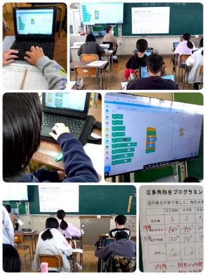 5年生の算数の時間です。「正多角形をプログラミングでかいてみよう」とのめあてで、図形をかいていました。内角の大きさを求め、タブレットに入力して描きます。数字を入力すれば、とても簡単に作成できます。