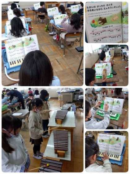 一年生の音楽です「たがいの楽器の音を聞き合いながら、演奏しましょう」をめあてに、「こいぬのマーチ」の合奏をしていました。鍵盤はハーモニカ、タンバリン、木琴、トライアングルなど、様々な楽器を使用し、楽しく演奏しています。