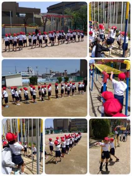 1年生の体育です。集合や整列の仕方を学習しました。先生の指示を聞きながら、さっと集合できるように頑張ってくださいね。後半は、のぼり棒やうんてい、鉄棒をしました。