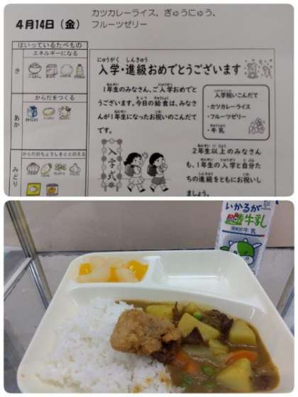 今日は、1年生が小学生になったお祝いの献立です。2年生以上のお友だちも1年生の入学と自分たちの進級をともにお祝いしましょう。