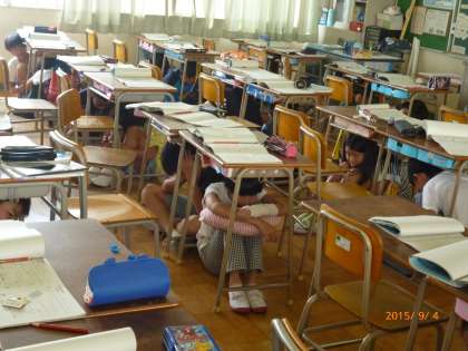 子ども達が、机の下に隠れている様子です。