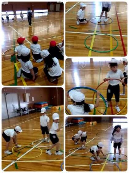 2年生の体育です。体ほぐしの運動をしていました。大きな輪にタイミングを合わせて、ジャンプ!!楽しく学習を進めています。