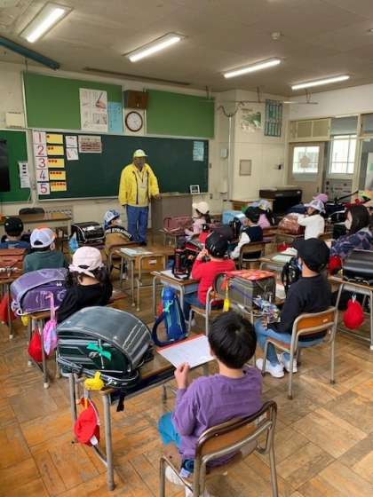 1年生の教室に区役所の「ラビット隊」の方が来られました。子どもたちの安心・安全のためにいつも見守りをしてくださっています。