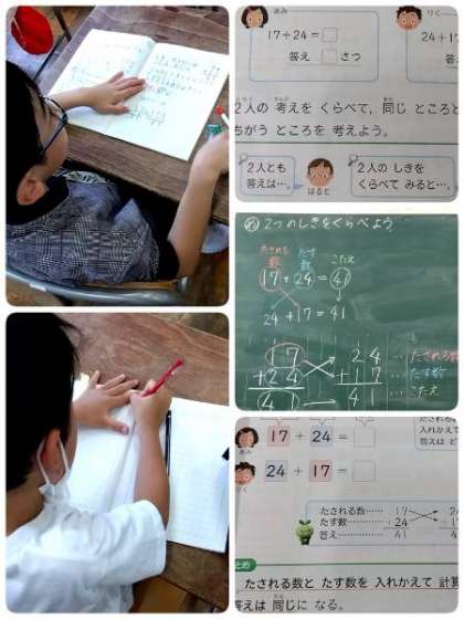 2年生の算数です。「二つの式をくらべよう」がめあてです。「17+24 と 24+17」の式について考えました。「たされる数とたす数を入れかえて計算しても答えは同じになる。」ことが分かりました。