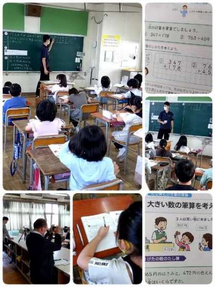 3年で研究授業(メンター研修)を行いました。算数科の単元「大きい数の筆算を考えよう(たし算とひき算のひっさん)」学習です。めあてを「くりあがりが2回以上ある、3ケタ+3ケタのひっさんのしかたを考えよう」とし、学習を進めました。