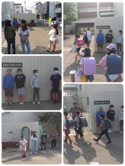 代表委員会の児童が正門で「おはようございます!!」と、元気にあいさつをしています。登校してきた児童も「おはようございます!!」と元気な声で答えています。