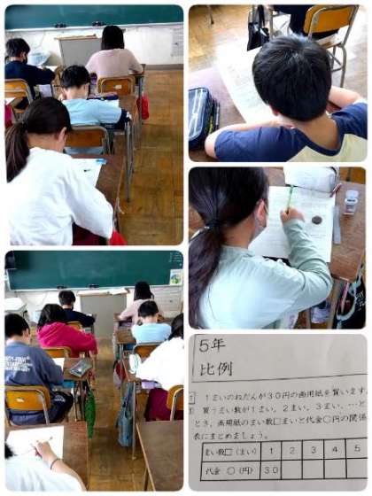 5年生の教室をのぞいてみると、算数の単元テストをしていました。みんな最後まで、あきらめず、真剣です。頑張っていますね。