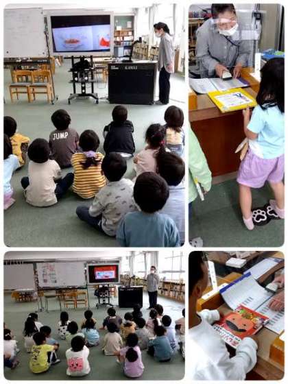 1年生の図書の時間です。自分で借りたい本を選んで、学校司書の方にバーコードを読んでもらっていました。最後に、「読み聞かせ」で「しりとりの大好きな王様」という本を読んでもらいました。おもしろかったですね。