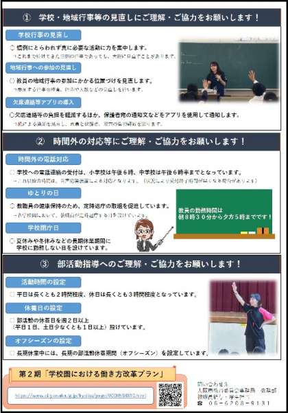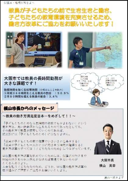 平素より本校の教育活動にご理解・ご協力をいただきありがとうございます。この度、大阪市教育委員会より教員の働き方改革に関する保護者の皆さまへの周知文書が届きましたので、下記リンク先からご覧ください。