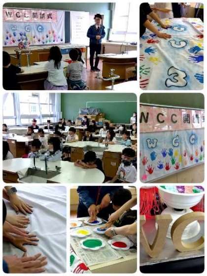 WCC(ワールド・コネクション・クラブ)の活動の開校式を行いました。新しく一年生も加わり、仲間が増えました。開校式の後、早速、活動に入り、WCCの旗に手形を押しました。一年間、様々な国の文化を学びます。