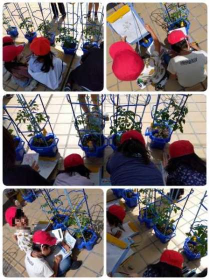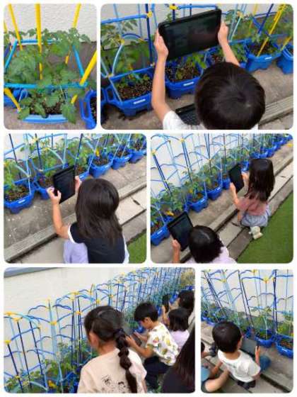 2年生は、生活科でミニトマトを育てています。今日は、タブレットを使って写真を撮っていました。そのあと、じっくり観察をしました。花も咲いています。もうすぐ、実ができてくることでしょう。