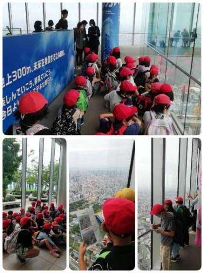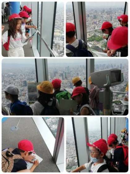 昨日、3年生は阿倍野ハルカスまで、社会見学に行きました。60階の展望室から、大阪市内の様子を見学しました。大阪市の東西南北について、それぞれの方角にある街並みの特徴について記録をつけていました。