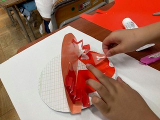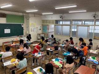 3年生の図工の時間です。子どもたちは、色とりどりの画用紙を使って作品作りをがんばっています。何ができるのでしょうか。完成が待ち遠しいです。