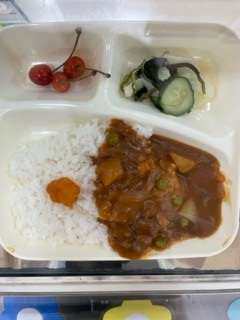 今日の給食は、「ハヤシライス」「ぎゅうにゅう」「ミックスかいそうのサラダ」「さくらんぼ」です。