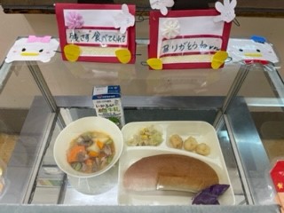 今日の給食は、「コッペパン」「ぎゅうにゅう」「いかてんぷら」 「フレッシュトマトのスープ煮」「キャベツとコーンのソテー」 「ブルーベリージャム」です。