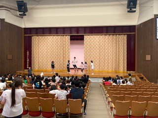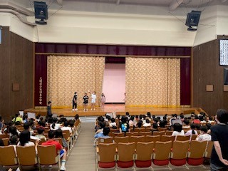 児童集会で、「UFOゲーム」をしました。子どもたちはなかよし班で楽しんでいました。