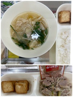 今日の給食は、「ごはん」「ゴーヤチャンプルー」「ごもくじる」