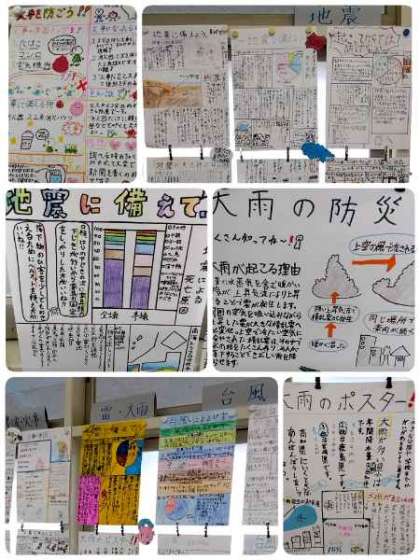 6年生の教室に「防災新聞」掲示されています。大雨や地震の時にどのようにすればよいかを調べ、まとめています。普段から「もしもの時」を意識しながら過ごすことが大切です。