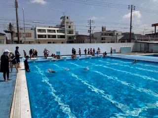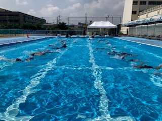 3・4年生の水泳運動の様子です。気温、水温も30度近くで、プール日和です。けのび、バタ足、クロールにつながる初歩的な泳ぎなど、できることがどんどん増えています!