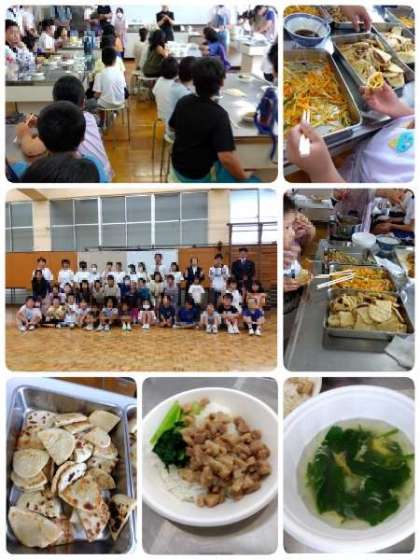 遊びの後には、保護者の方のご協力でお昼ご飯を頂きました。「ルーローハン」(台湾)「ロージャーモー」(中国)とわかめスープです。とてもおいしくいただきました。