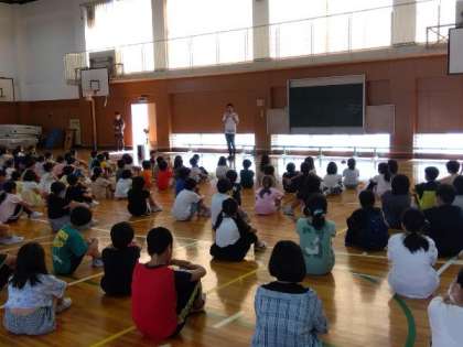 児童朝会を体育館で行いました。夏休みまで、あと少しです。整理整頓をしながら、1学期のまとめをしていきましょう。また、交通事故のほとんどが、家から近い場所で起きています。油断することなく、交通ルールを守って過ごすようにしましょう。